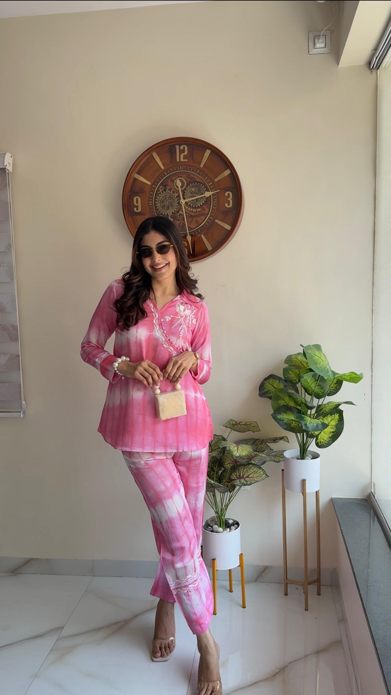 Step into effortless elegance with our Hand-Tie-Dye Printed Coord Set, crafted in a striking blend of soft pink pastel and white. Made from premium Chanderi modal fabric, this luxurious and breathable set is perfect for any occasion, seamlessly blending comfort with sophistication.