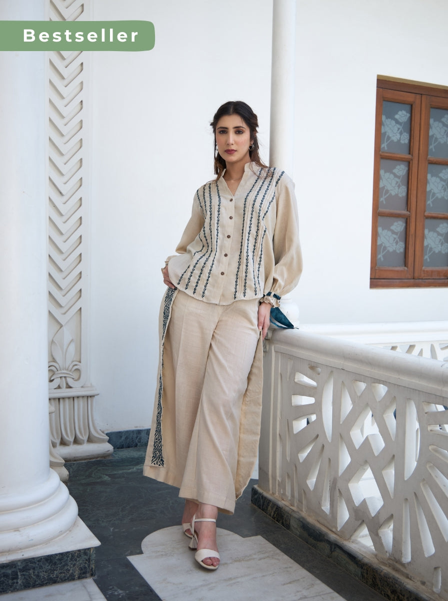 The regular-fit shirt features refined pintuck detailing and a sleek band collar for a polished touch. The back panel stands out with a contrasting teal Shibori hand tie-dye print, adding a modern edge. The front and sleeves are adorned with teal Chikankari hand embroidery, blending tradition with contemporary style. The elasticated hem sleeves are elevated with matching Chikankari embroidery and Shibori print, adding a hint of drama and texture.