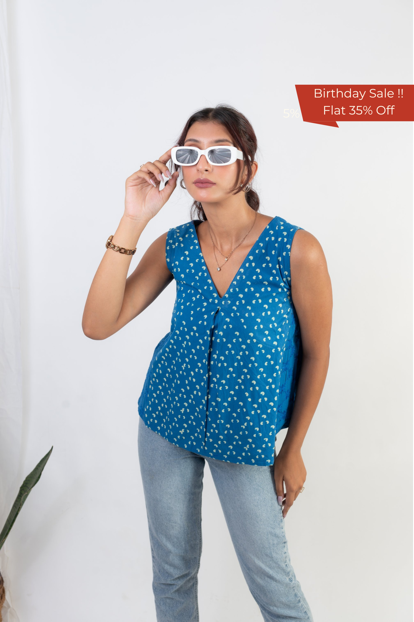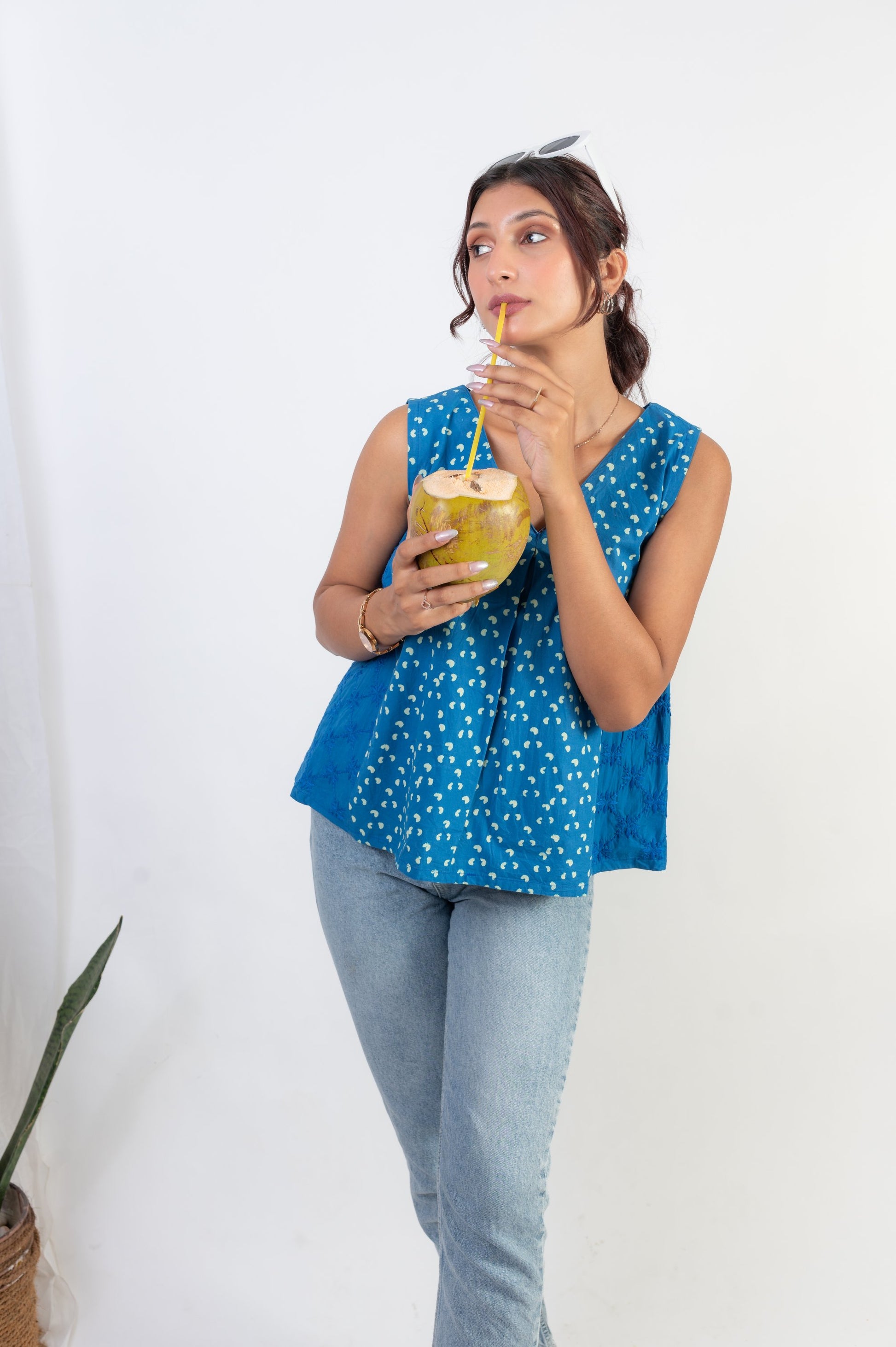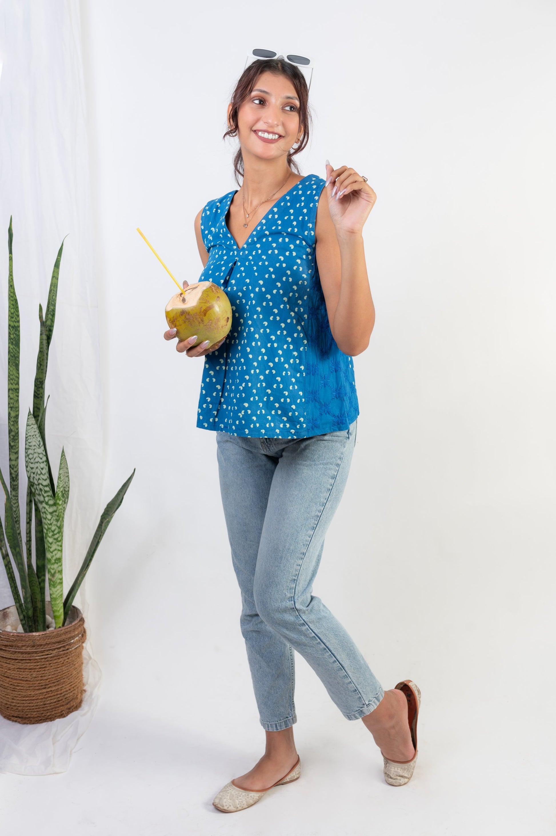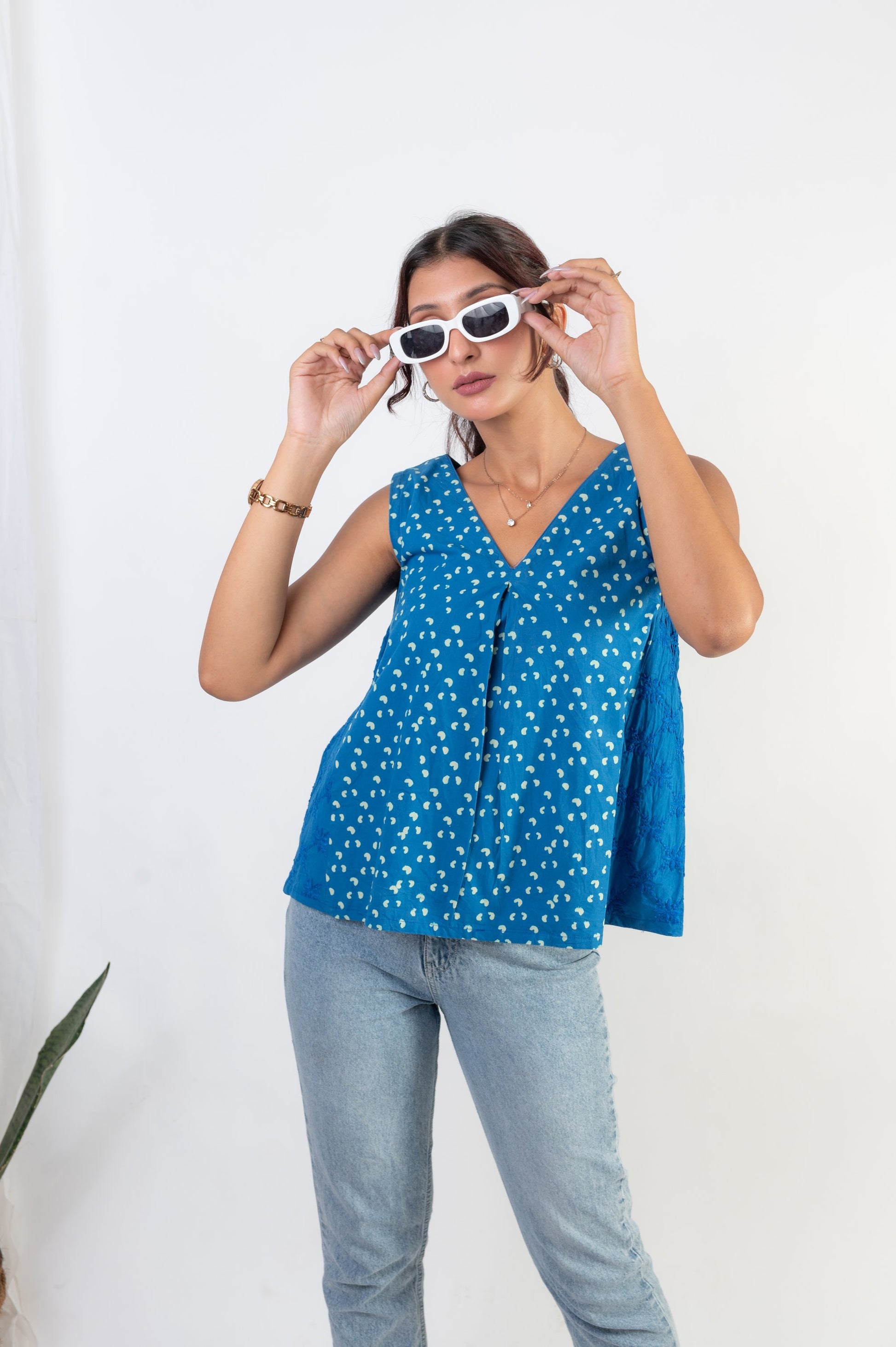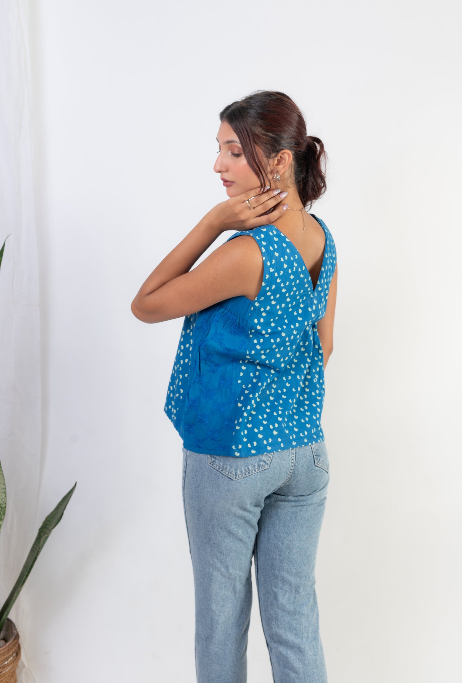This chic cut Top is smart in the front and bold at the side. Made from our exclusive Indigo and white polka dot handblock printed cotton, it features a V-neck pattern with a dramatic box pleat. The ultra-stylish side panel with elasticated armholes and intricate self-thread chikankari hand embroidery adds an extra touch of elegance. This blend of two different handcrafts – hand-block print and chikankari hand embroidery – creates a top that is both trendy and rooted in traditional craftsmanship.