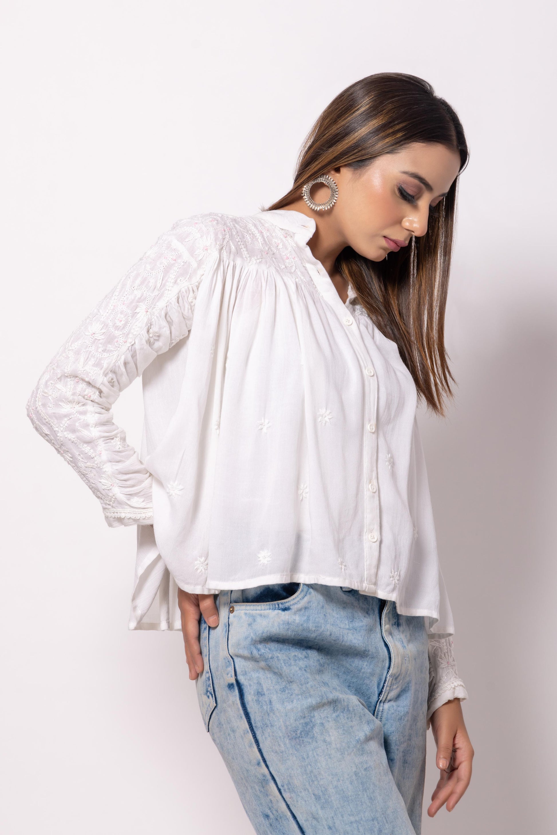 Our most-loved white shirt is back! Crafted from lightweight crushed cotton fabric, this airy and flarey silhouette offers the perfect blend of elegance and comfort. Adorned with delicate Chikankari hand embroidery, this timeless piece is ideal for the summer heat.