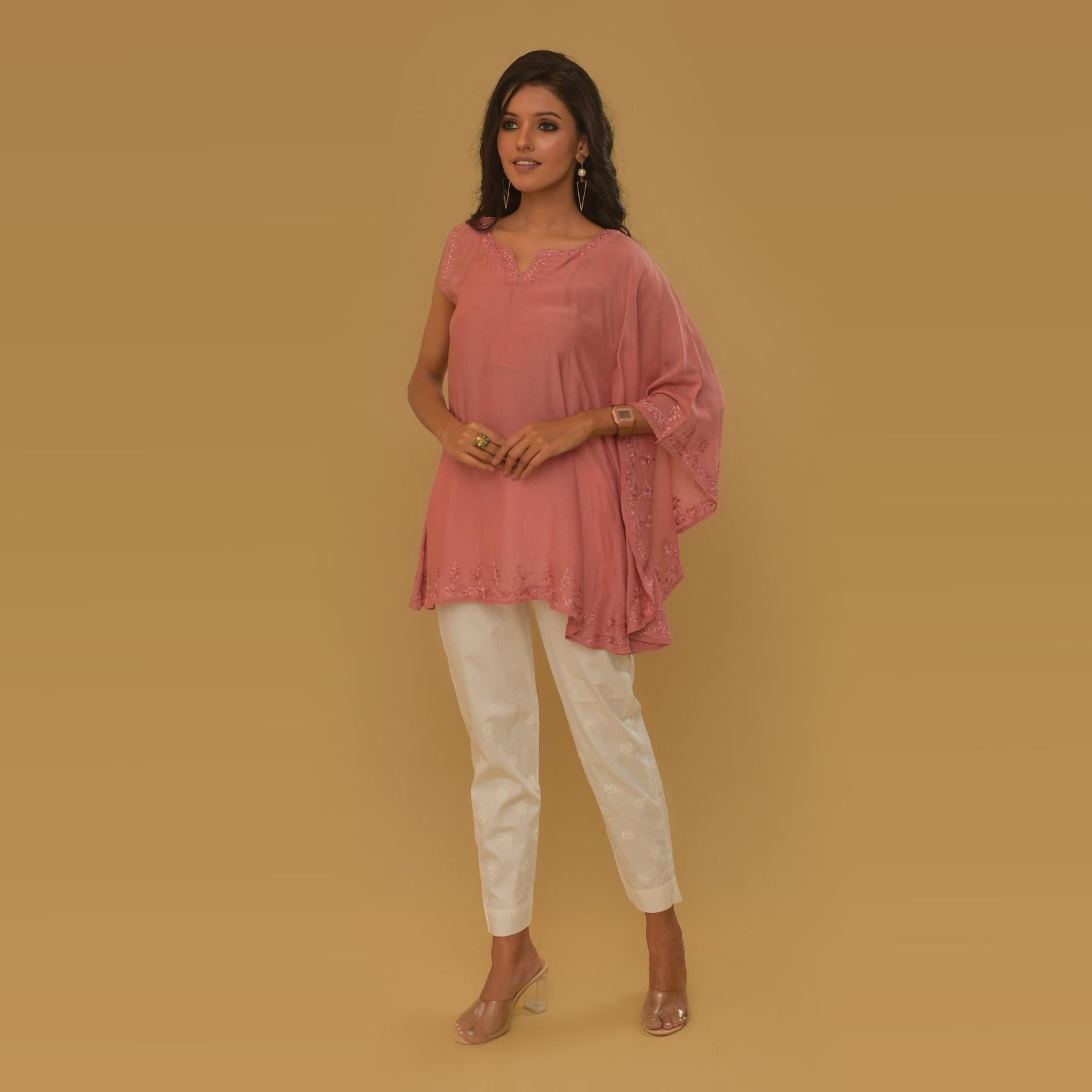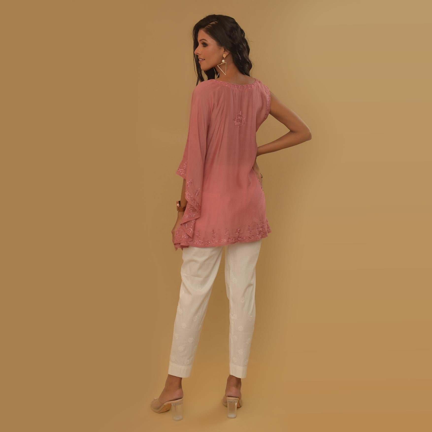 - Pink silk muslin chikankari one side kaftan look top.