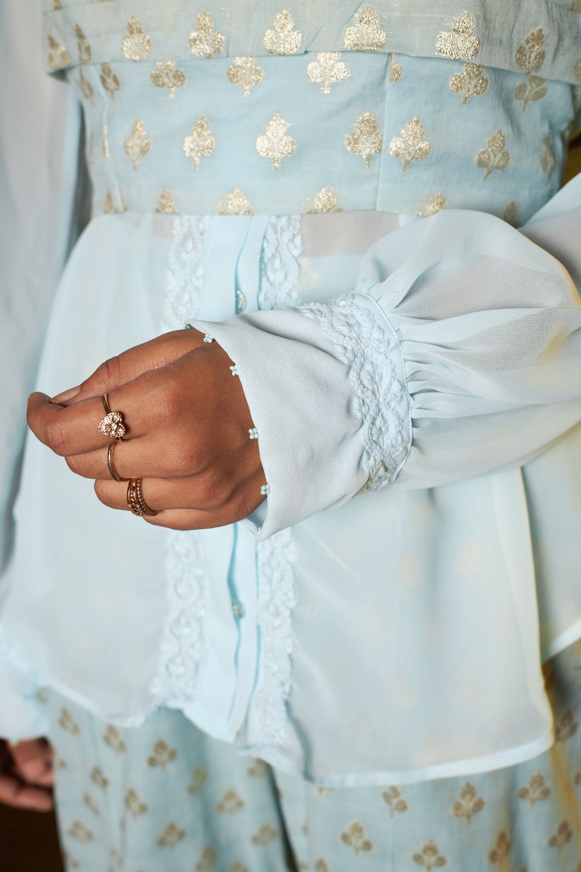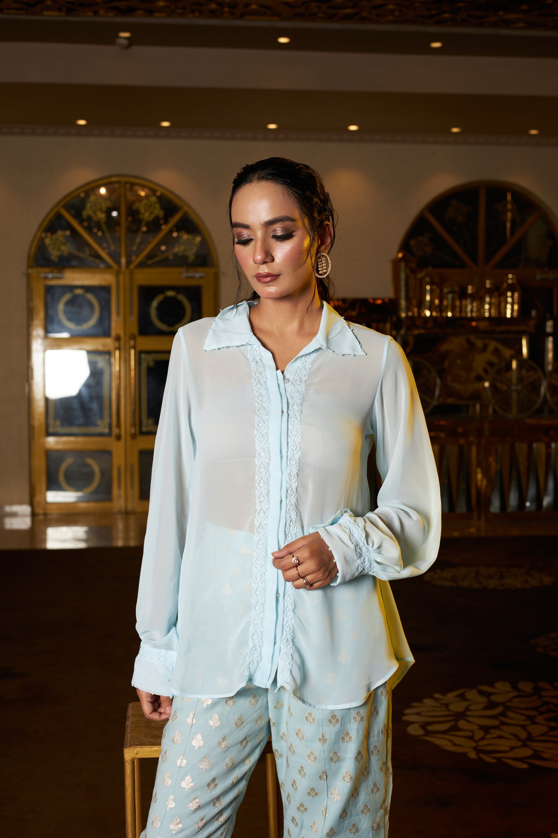 The Sapphire Shirt is a delicate light blue georgette piece that brings elegance and versatility to any wardrobe.
