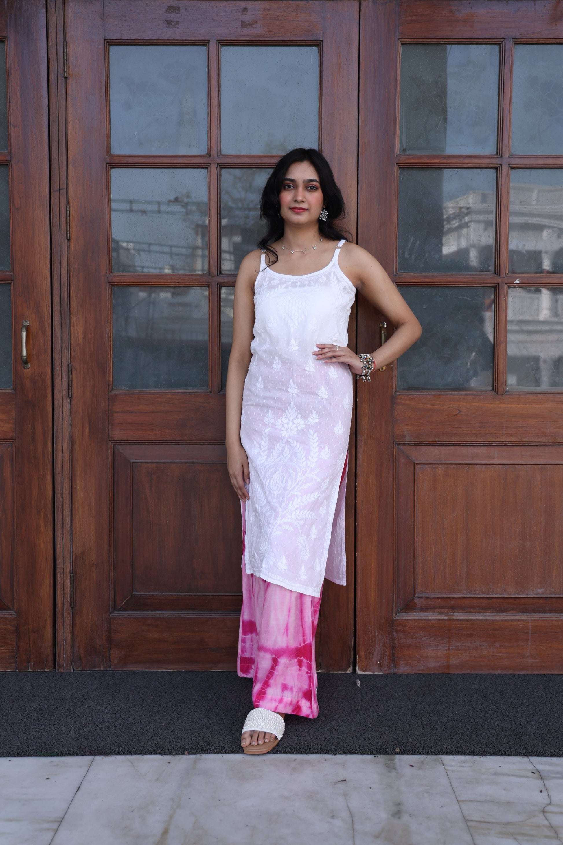 Effortlessly chic and playful, this Sleeveless Strap Chikankari Kurti is a must-have for your casual wardrobe. Made from 100% pure cotton, it offers breathability and comfort, perfect for the summer.